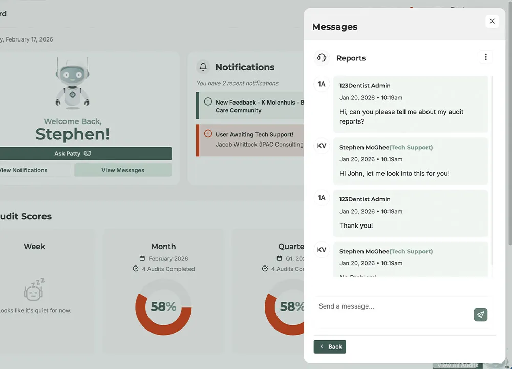 Executive features adapt the dashboard based on role and industry, giving leaders a clear single source of truth. Executives can track compliance across all sites or drill into a specific practice, while site leads and team members see the details they need to act.